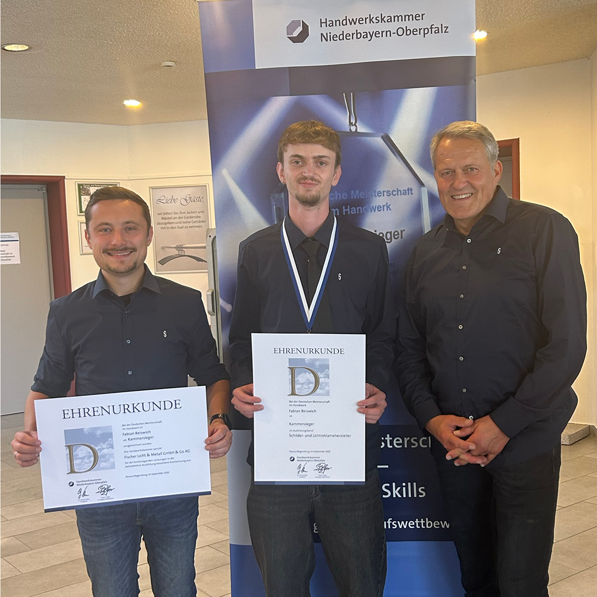Wir gratulieren Fabian Reiswich herzlich zu seinem Erfolg. Bei der Abschlussfeier der Handwerkskammer Niederbayern-Oberpfalz am 27. September 2025 in Deggendorf wurde er als Kammersieger im Beruf Schilder- und Lichtreklamehersteller ausgezeichnet.